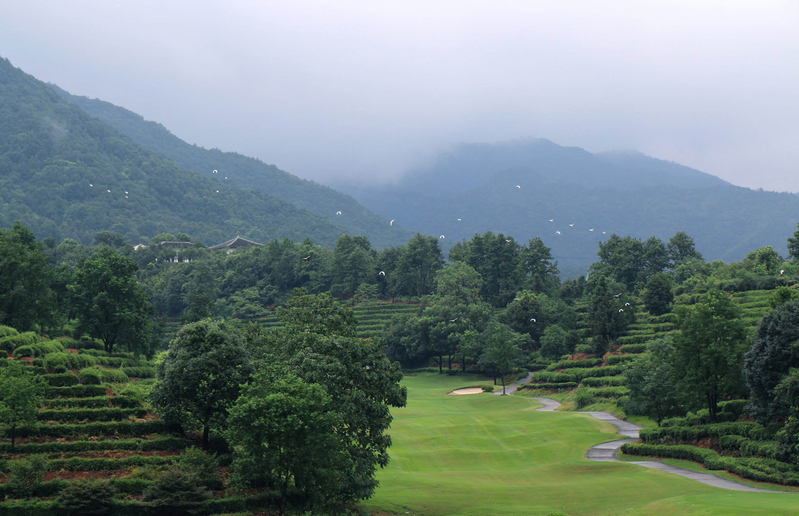 HangZhou Fuchun Resort is located in Longjing tea gardens, the only 18-hole course in Asia themed on hills and tea gardens. The first 9 holes feature tea gardens and hills, the last 9 have streams and lakes. Designed by Daniel J. Obermeyer, it has tea trees along fairways, evoking “Dwelling in the Fuchun Mountains”. Focusing on precision, with a Song-style clubhouse, it offers unique golfing fun.
